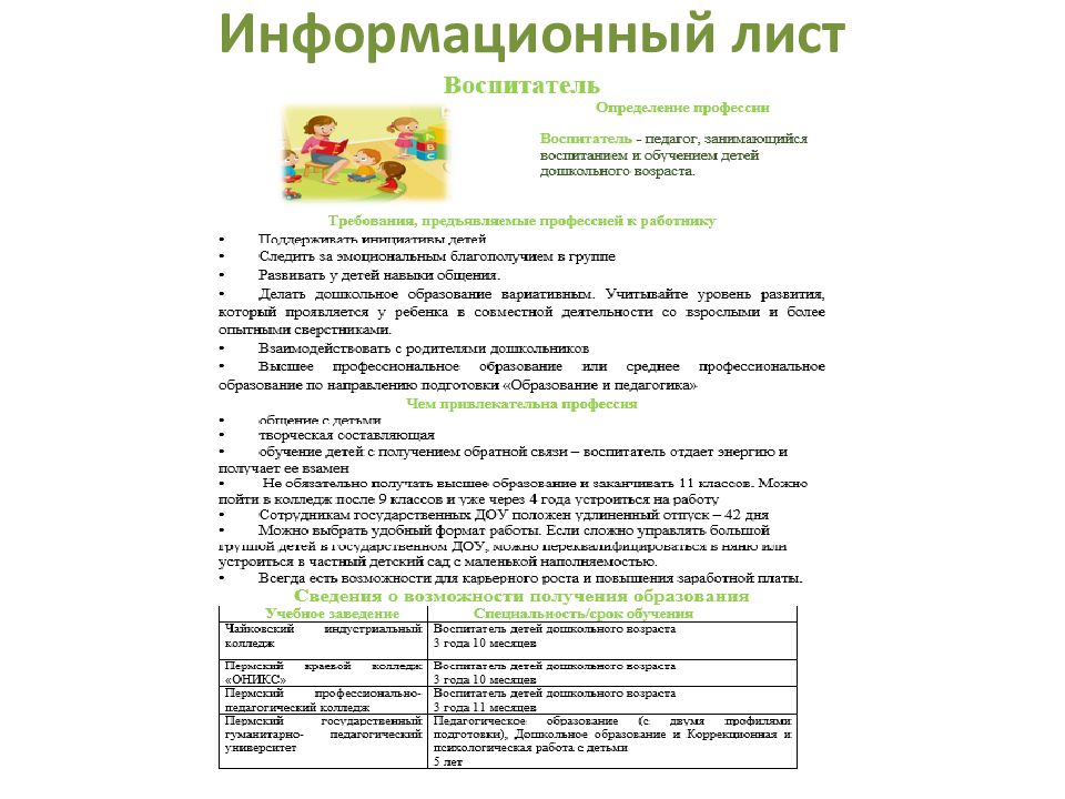 1)Повышение информационной компетентности о том, что такое информационный лист и его виды. 2)Умение определять структуру (содержание) информационного листа по профессии воспитатель. 3)Повышение информационной компетентности о профессии воспитатель. 4)Создан информационный лист по профессии воспитатель в программе word.