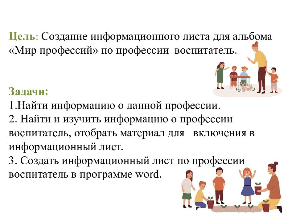 Слайд 2: Цель : Создание информационного листа для альбома «Мир профессий» по профессии воспитатель. Задачи: 1.Найти информацию о данной профессии. 2. Найти и изучить информацию о профессии воспитатель, отобрать материал для включения в информационный лист. 3. Создать информационный лист по профессии воспитатель в программе word