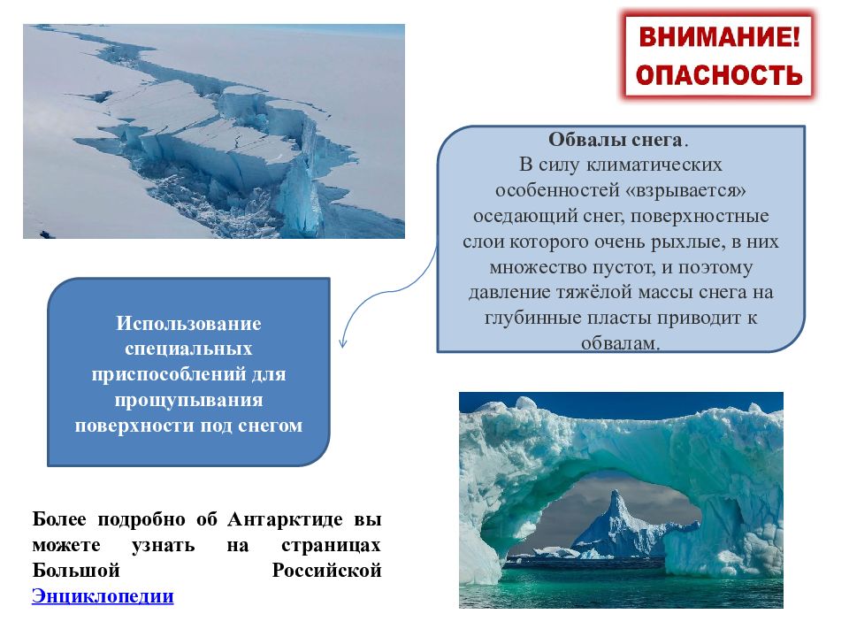 Обвалы снега. В силу климатических особенностей «взрывается» оседающий снег, поверхностные слои которого очень рыхлые, в них множество пустот, и поэтому давление тяжёлой массы снега на глубинные пласты приводит к обвалам. Использование специальных приспособлений для прощупывания поверхности под снегом Более подробно об Антарктиде вы можете узнать на страницах Большой Российской Энциклопедии