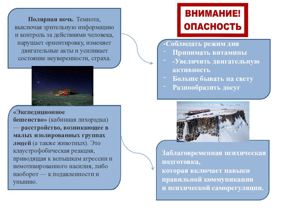 « Экспедиционное бешенство» ( кабинная лихорадка) — расстройство, возникающее в малых изолированных группах людей (а также животных). Это клаустрофобическая реакция, приводящая к вспышкам агрессии и немотивированного насилия, либо наоборот — к подавленности и унынию. Полярная ночь. Темнота, выключая зрительную информацию и контроль за действиями человека, нарушает ориентировку, изменяет двигательные акты и усиливает состояние неуверенности, страха. -Соблюдать режим дня Принимать витамины -Увеличить двигательную активность Больше бывать на свету Разнообразить досуг Заблаговременная психическая подготовка, которая включает навыки правильной коммуникации и психической саморегуляции.