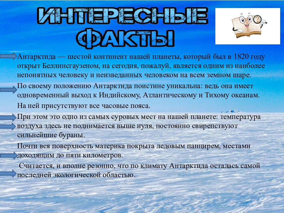 Антарктида — шестой континент нашей планеты, который был в 1820 году открыт Беллинсгаузеном, на сегодня, пожалуй, является одним из наиболее непонятных человеку и неизведанных человеком на всем земном шаре. По своему положению Антарктида поистине уникальна: ведь она имеет одновременный выход к Индийскому, Атлантическому и Тихому океанам. На ней присутствуют все часовые пояса. При этом это одно из самых суровых мест на нашей планете: температура воздуха здесь не поднимается выше нуля, постоянно свирепствуют сильнейшие бураны. Почти вся поверхность материка покрыта ледовым панцирем, местами доходящим до пяти километров. Считается, и вполне резонно, что по климату Антарктида осталась самой последней экологической областью.