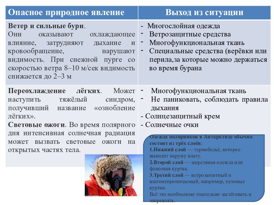Опасное природное явление Выход из ситуации Ветер и сильные бури. Они оказывают охлаждающее влияние, затрудняют дыхание и кровообращение, нарушают видимость. При снежной пурге со скоростью ветра 8–10 м/сек видимость снижается до 2–3 м - Многослойная одежда Ветрозащитные средства Многофункциональная ткань Специальные средства (верёвки или перила,за которые можно держаться во время бурана Переохлаждение лёгких. Может наступить тяжёлый синдром, получивший название «ознобление лёгких». Световые ожоги. Во время полярного дня интенсивная солнечная радиация может вызвать световые ожоги на открытых частях тела. Многофункциональная ткань Не паниковать, соблюдать правила дыхания - Солнцезащитный крем - Солнечные очки Одежда полярников в Антарктиде обычно состоит из трёх слоёв : Нижний слой — термобельё, которое выводит наружу влагу. Второй слой — шерстяная одежда или флисовая куртка. Третий слой — ветрозащитный и влагонепроницаемый, например, пуховые куртки. Всё это необходимо тщательно застёгивать и заправлять.