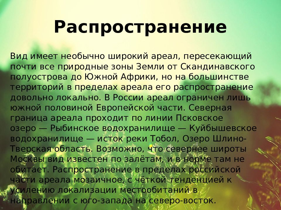 Вид имеет необычно широкий ареал, пересекающий почти все природные зоны Земли от Скандинавского полуострова до Южной Африки, но на большинстве территорий в пределах ареала его распространение довольно локально. В России ареал ограничен лишь южной половиной Европейской части. Северная граница ареала проходит по линии Псковское озеро — Рыбинское водохранилище — Куйбышевское водохранилище — исток реки Тобол, Озеро Шлино-Тверская область. Возможно, что севернее широты Москвы вид известен по залётам, и в норме там не обитает. Распространение в пределах российской части ареала мозаичное, с чёткой тенденцией к усилению локализации местообитаний в направлении с юго-запада на северо-восток.