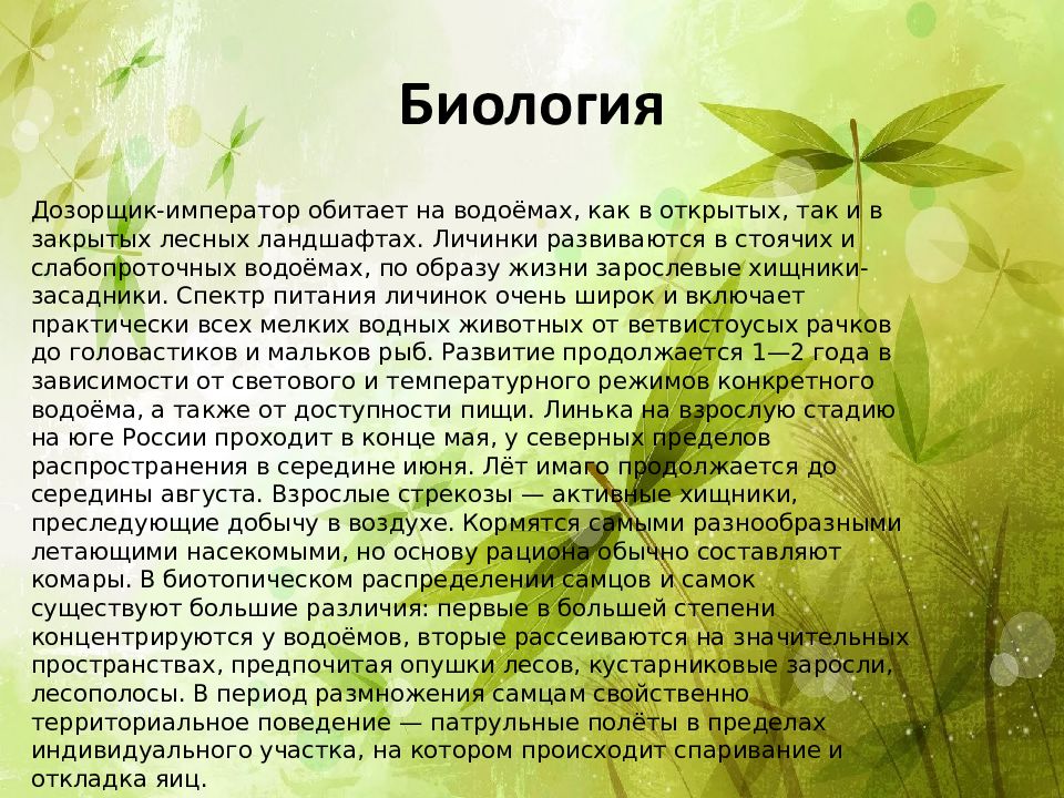 Дозорщик-император обитает на водоёмах, как в открытых, так и в закрытых лесных ландшафтах. Личинки развиваются в стоячих и слабопроточных водоёмах, по образу жизни зарослевые хищники-засадники. Спектр питания личинок очень широк и включает практически всех мелких водных животных от ветвистоусых рачков до головастиков и мальков рыб. Развитие продолжается 1—2 года в зависимости от светового и температурного режимов конкретного водоёма, а также от доступности пищи. Линька на взрослую стадию на юге России проходит в конце мая, у северных пределов распространения в середине июня. Лёт имаго продолжается до середины августа. Взрослые стрекозы — активные хищники, преследующие добычу в воздухе. Кормятся самыми разнообразными летающими насекомыми, но основу рациона обычно составляют комары. В биотопическом распределении самцов и самок существуют большие различия: первые в большей степени концентрируются у водоёмов, вторые рассеиваются на значительных пространствах, предпочитая опушки лесов, кустарниковые заросли, лесополосы. В период размножения самцам свойственно территориальное поведение — патрульные полёты в пределах индивидуального участка, на котором происходит спаривание и откладка яиц.