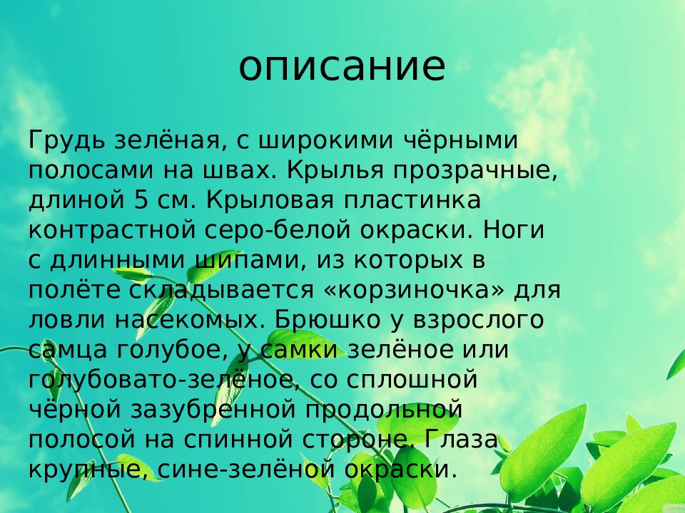 Грудь зелёная, с широкими чёрными полосами на швах. Крылья прозрачные, длиной 5 см. Крыловая пластинка контрастной серо-белой окраски. Ноги с длинными шипами, из которых в полёте складывается «корзиночка» для ловли насекомых. Брюшко у взрослого самца голубое, у самки зелёное или голубовато-зелёное, со сплошной чёрной зазубренной продольной полосой на спинной стороне. Глаза крупные, сине-зелёной окраски.
