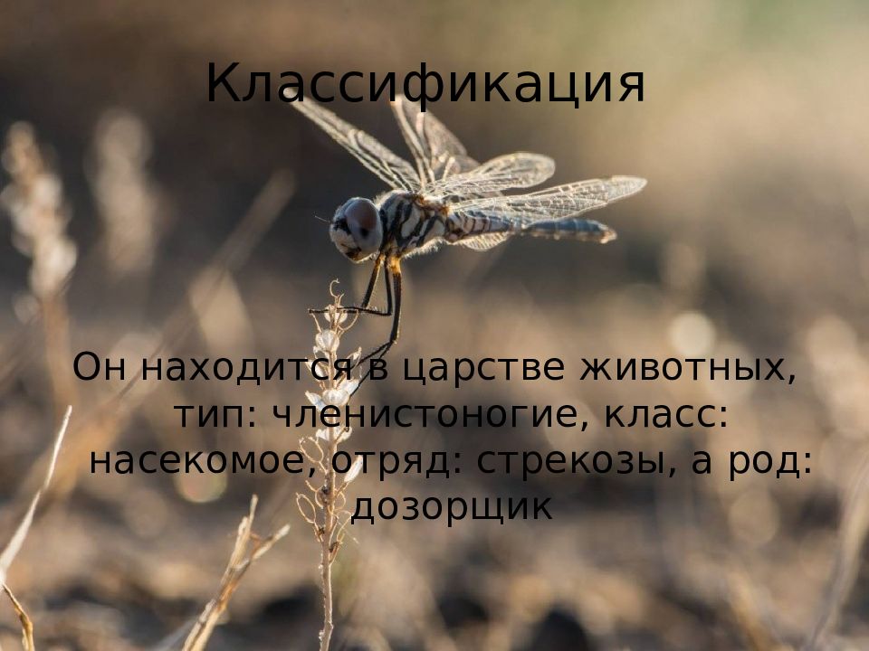 Он находится в царстве животных, тип: членистоногие, класс: насекомое, отряд: стрекозы, а род: дозорщик