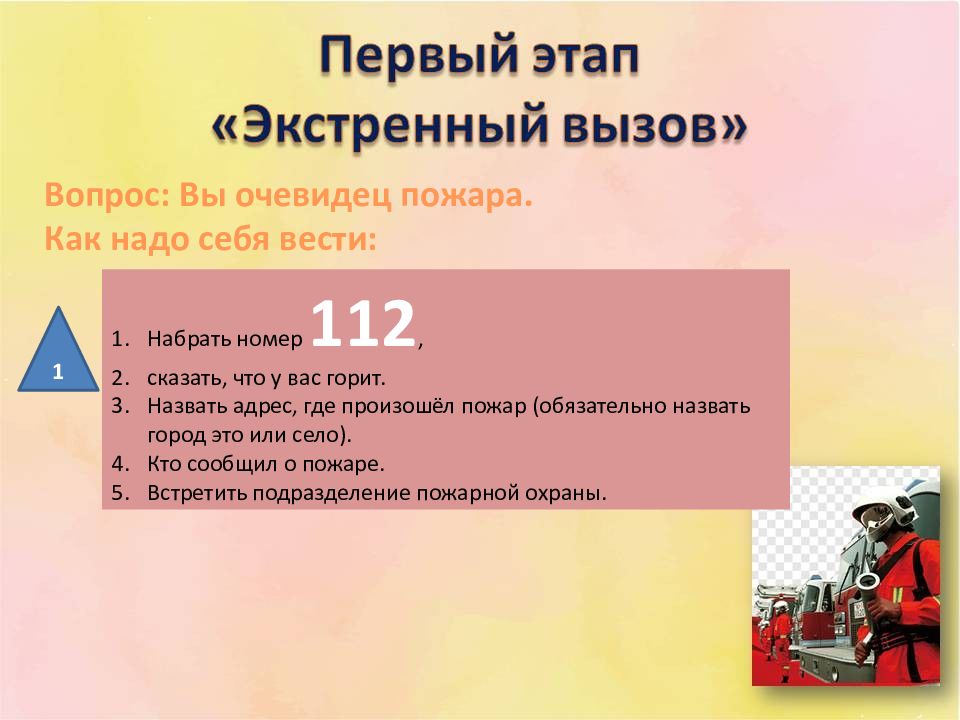 Вопрос: Вы очевидец пожара. Как надо себя вести: Набрать номер 112, сказать, что у вас горит. Назвать адрес, где произошёл пожар (обязательно назвать город это или село). Кто сообщил о пожаре. Встретить подразделение пожарной охраны. 1