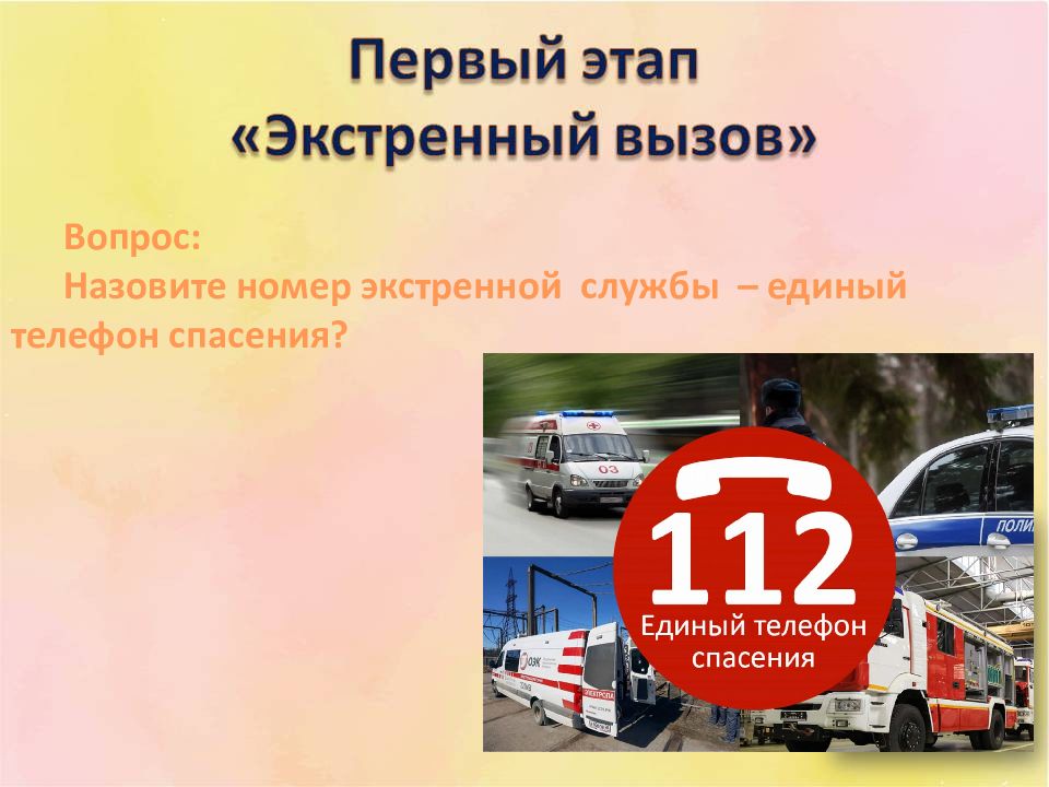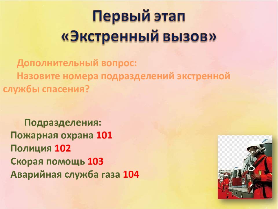 Дополнительный вопрос: Назовите номера подразделений экстренной службы спасения? Подразделения: Пожарная охрана 101 Полиция 102 Скорая помощь 103 Аварийная служба газа 104