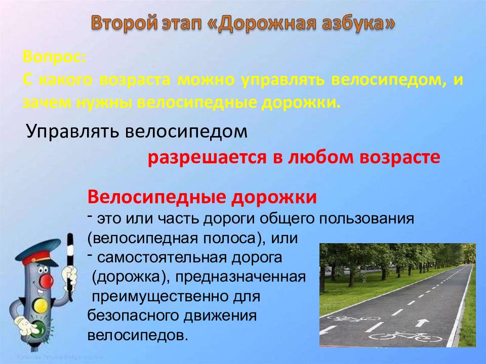 Вопрос: С какого возраста можно управлять велосипедом, и зачем нужны велосипедные дорожки. Управлять велосипедом разрешается в любом возрасте Велосипедные дорожки это или часть дороги общего пользования (велосипедная полоса), или самостоятельная дорога (дорожка), предназначенная преимущественно для безопасного движения велосипедов.