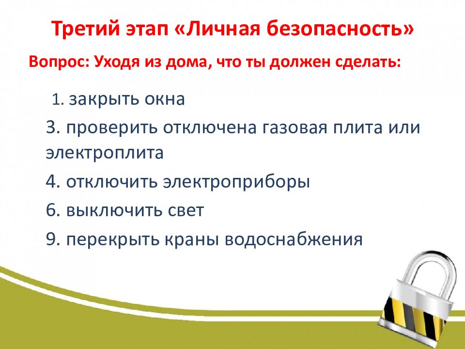 1. закрыть окна 3. проверить отключена газовая плита или электроплита 4. отключить электроприборы 6. выключить свет 9. перекрыть краны водоснабжения Третий этап «Личная безопасность» Вопрос: Уходя из дома, что ты должен сделать: