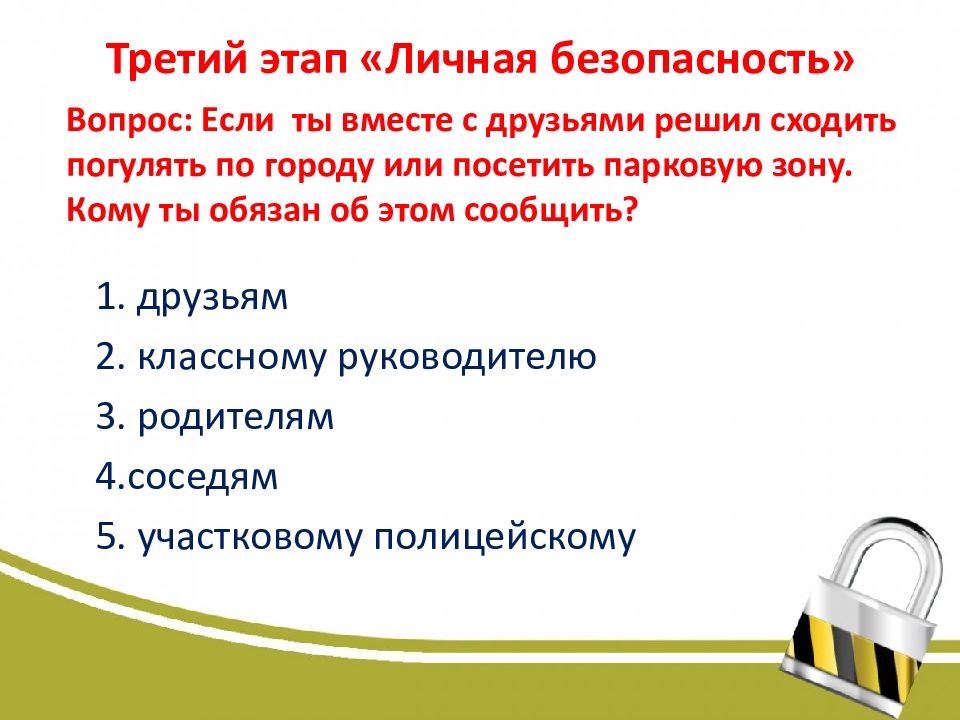 1. друзьям 2. классному руководителю 3. родителям 4.соседям 5. участковому полицейскому Третий этап «Личная безопасность» Вопрос: Если ты вместе с друзьями решил сходить погулять по городу или посетить парковую зону. Кому ты обязан об этом сообщить?