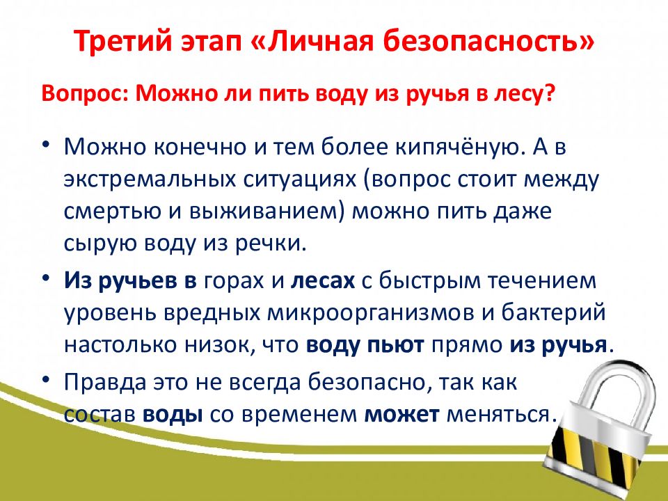 Можно конечно и тем более кипячёную. А в экстремальных ситуациях (вопрос стоит между смертью и выживанием) можно пить даже сырую воду из речки. Из ручьев в горах и лесах с быстрым течением уровень вредных микроорганизмов и бактерий настолько низок, что воду пьют прямо из ручья. Правда это не всегда безопасно, так как состав воды со временем может меняться. Третий этап «Личная безопасность» Вопрос: Можно ли пить воду из ручья в лесу?