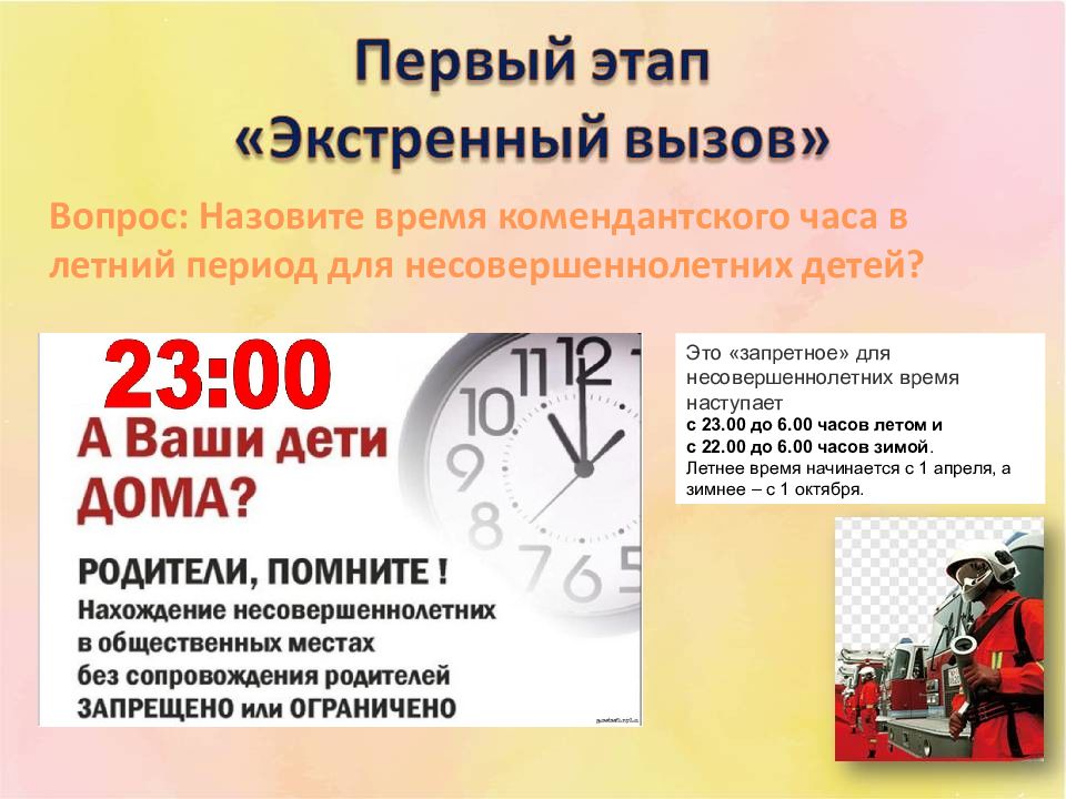 Вопрос: Назовите время комендантского часа в летний период для несовершеннолетних детей? Это «запретное» для несовершеннолетних время наступает с 23.00 до 6.00 часов летом и с 22.00 до 6.00 часов зимой. Летнее время начинается с 1 апреля, а зимнее – с 1 октября.