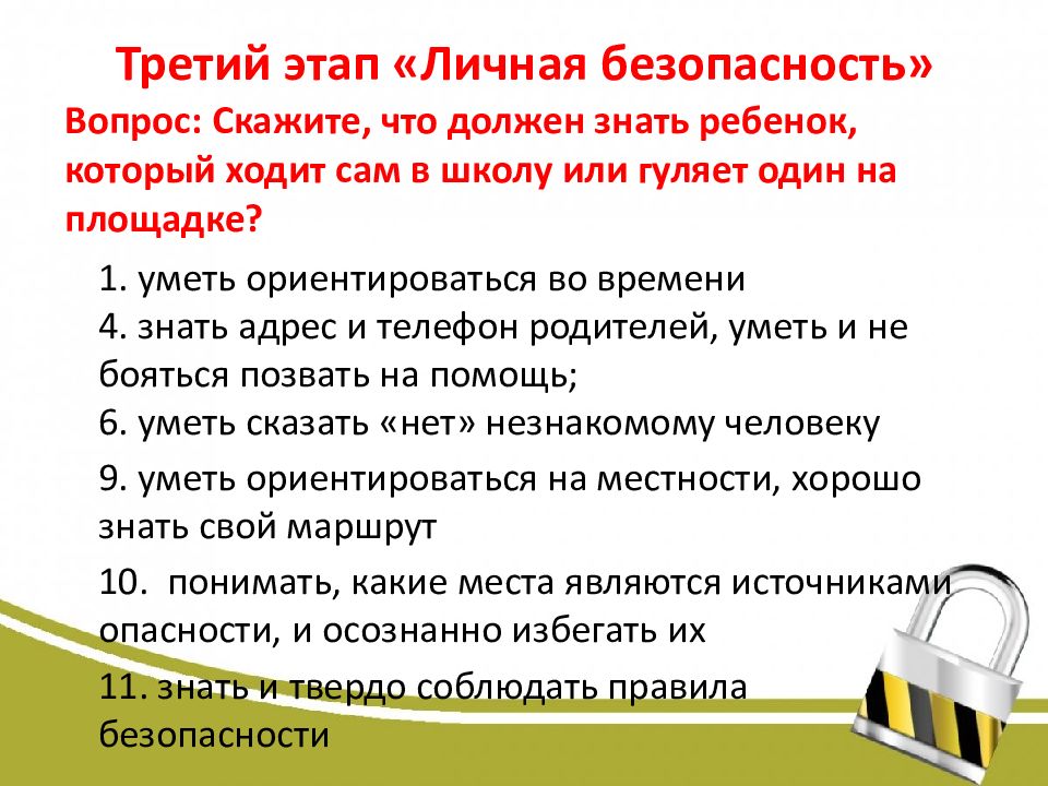 1. уметь ориентироваться во времени 4. знать адрес и телефон родителей, уметь и не бояться позвать на помощь; 6. уметь сказать «нет» незнакомому человеку 9. уметь ориентироваться на местности, хорошо знать свой маршрут 10. понимать, какие места являются источниками опасности, и осознанно избегать их 11. знать и твердо соблюдать правила безопасности Третий этап «Личная безопасность» Вопрос: Скажите, что должен знать ребенок, который ходит сам в школу или гуляет один на площадке?