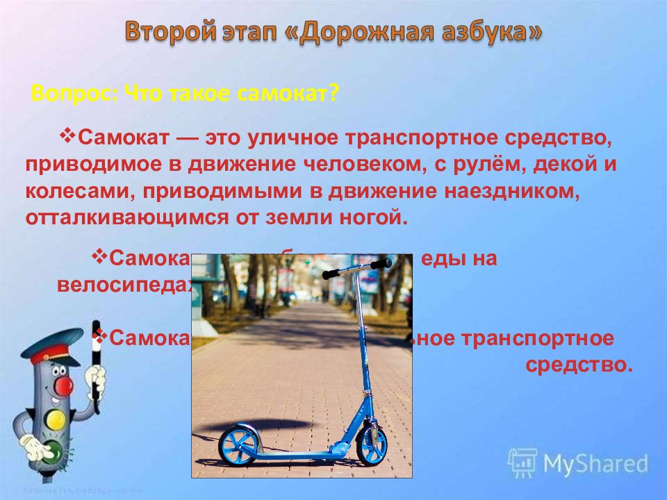 Вопрос: Что такое самокат? Самокат — это уличное транспортное средство, приводимое в движение человеком, с рулём, декой и колесами, приводимыми в движение наездником, отталкивающимся от земли ногой. Самокат – служба доставки еды на велосипедах Самокат - отличное мобильное транспортное средство.