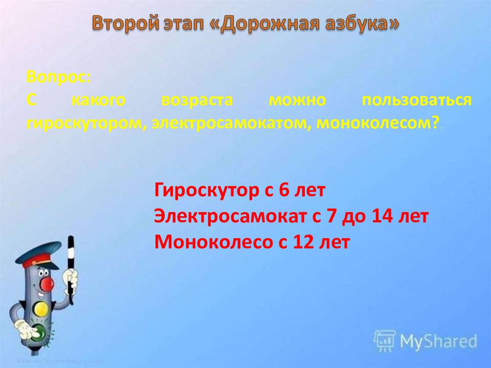 Вопрос: С какого возраста можно пользоваться гироскутором, электросамокатом, моноколесом ?. Гироскутор с 6 лет Электросамокат с 7 до 14 лет Моноколесо с 12 лет