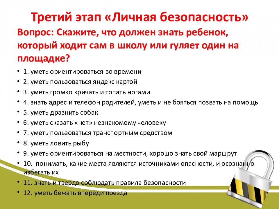 1. уметь ориентироваться во времени 2. уметь пользоваться яндекс картой 3. уметь громко кричать и топать ногами 4. знать адрес и телефон родителей, уметь и не бояться позвать на помощь 5. уметь дразнить собак 6. уметь сказать «нет» незнакомому человеку 7. уметь пользоваться транспортным средством 8. уметь ловить рыбу 9. уметь ориентироваться на местности, хорошо знать свой маршрут 10. понимать, какие места являются источниками опасности, и осознанно избегать их 11. знать и твердо соблюдать правила безопасности 12. уметь бежать впереди поезда Третий этап «Личная безопасность» Вопрос: Скажите, что должен знать ребенок, который ходит сам в школу или гуляет один на площадке?