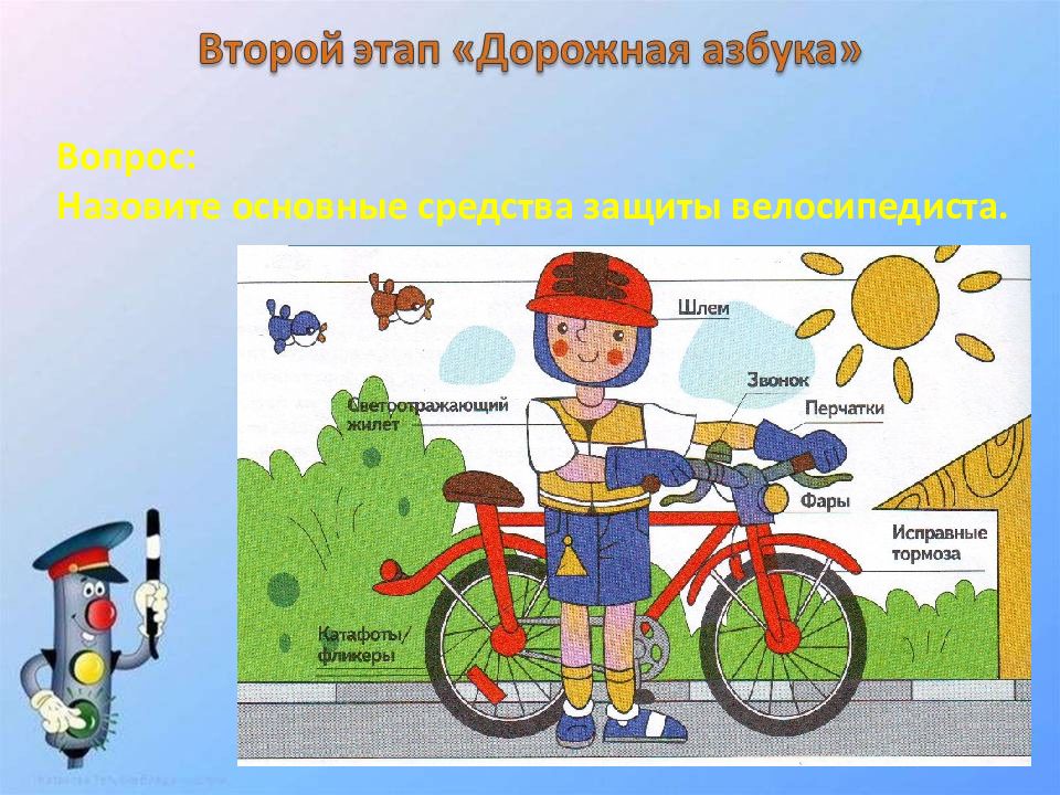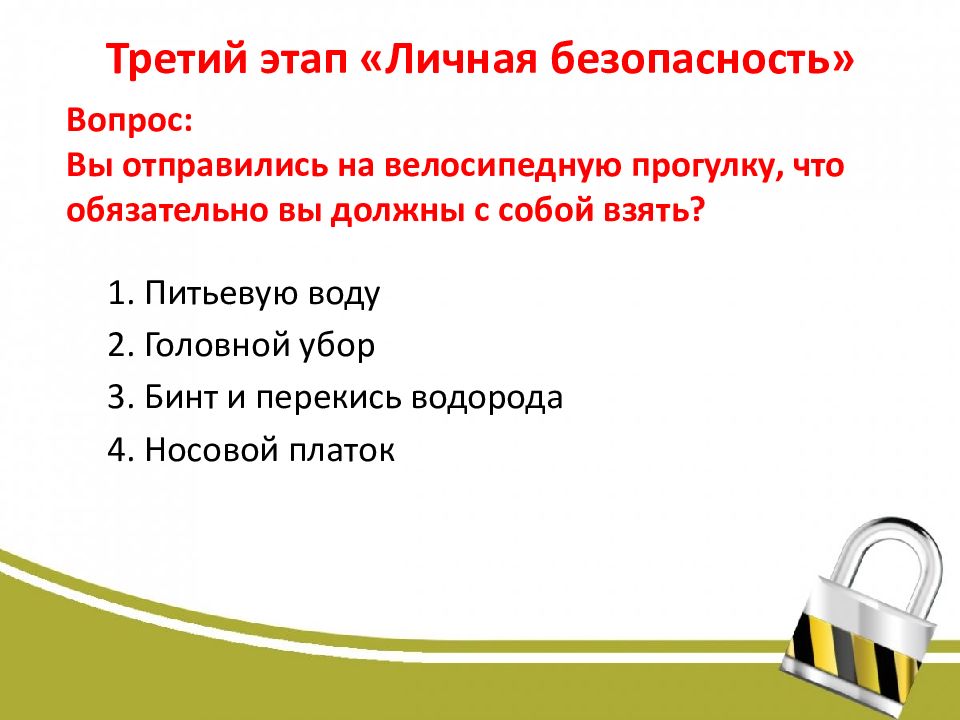 1. Питьевую воду 2. Головной убор 3. Бинт и перекись водорода 4. Носовой платок Третий этап «Личная безопасность» Вопрос: Вы отправились на велосипедную прогулку, что обязательно вы должны с собой взять?