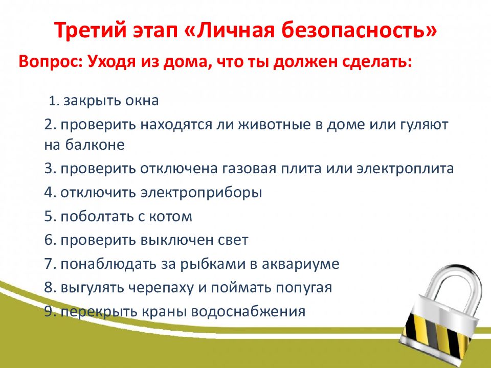 1. закрыть окна 2. проверить находятся ли животные в доме или гуляют на балконе 3. проверить отключена газовая плита или электроплита 4. отключить электроприборы 5. поболтать с котом 6. проверить выключен свет 7. понаблюдать за рыбками в аквариуме 8. выгулять черепаху и поймать попугая 9. перекрыть краны водоснабжения Третий этап «Личная безопасность» Вопрос: Уходя из дома, что ты должен сделать:
