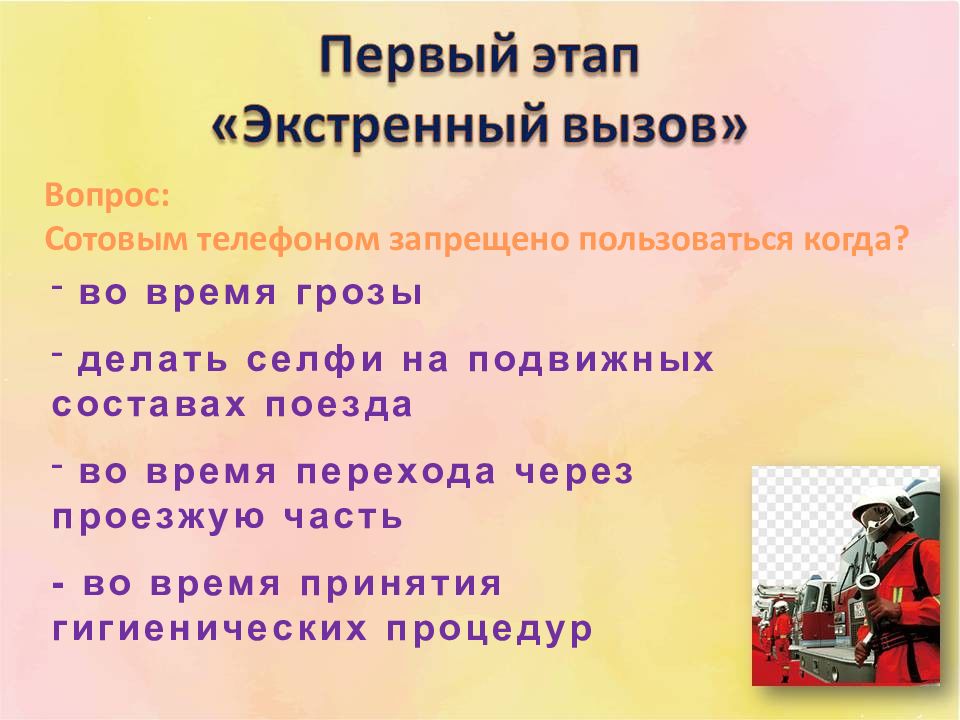 Вопрос: Сотовым телефоном запрещено пользоваться когда? во время грозы делать селфи на подвижных составах поезда во время перехода через проезжую часть - во время принятия гигиенических процедур