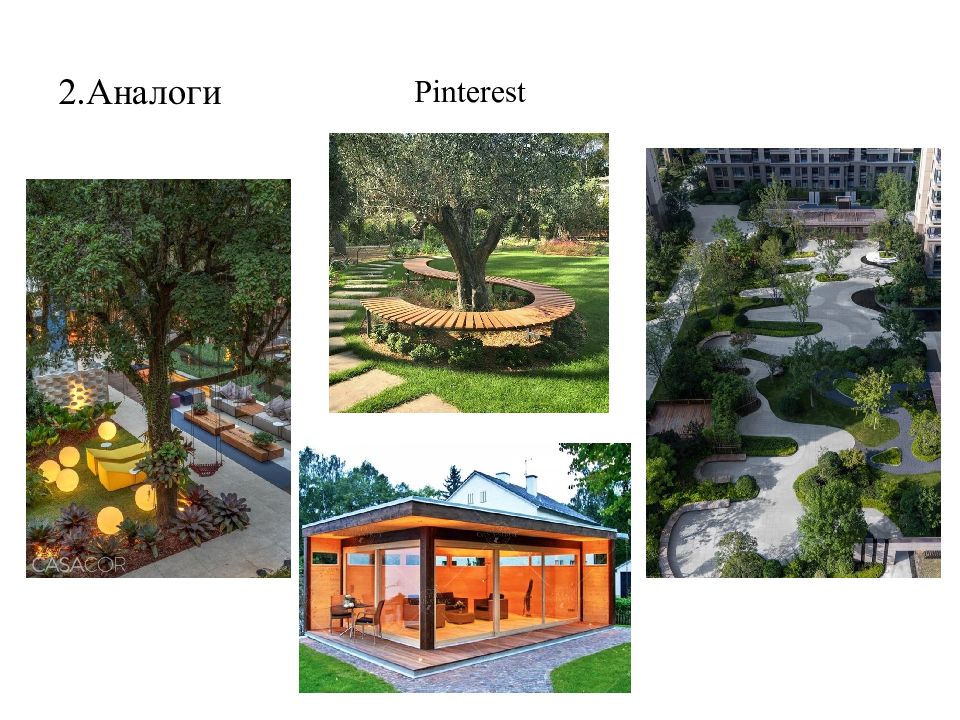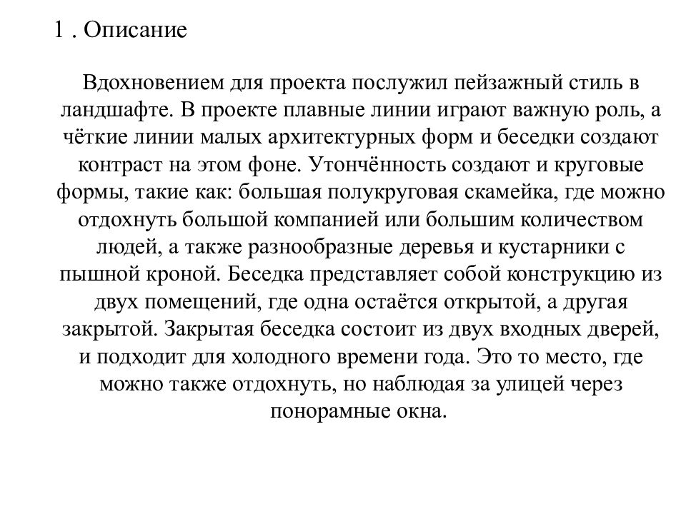 Вдохновением для проекта послужил пейзажный стиль в ландшафте. В проекте плавные линии играют важную роль, а чёткие линии малых архитектурных форм и беседки создают контраст на этом фоне. Утончённость создают и круговые формы, такие как: большая полукруговая скамейка, где можно отдохнуть большой компанией или большим количеством людей, а также разнообразные деревья и кустарники с пышной кроной. Беседка представляет собой конструкцию из двух помещений, где одна остаётся открытой, а другая закрытой. Закрытая беседка состоит из двух входных дверей, и подходит для холодного времени года. Это то место, где можно также отдохнуть, но наблюдая за улицей через понорамные окна.