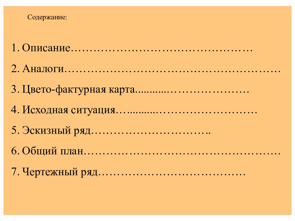 Описание………………………………………… Аналоги………………………………………………… Цвето-фактурная карта...........…………………. Исходная ситуация…..........……………………… Эскизный ряд………………………….. Общий план……………………………………………. Чертежный ряд…………………………………
