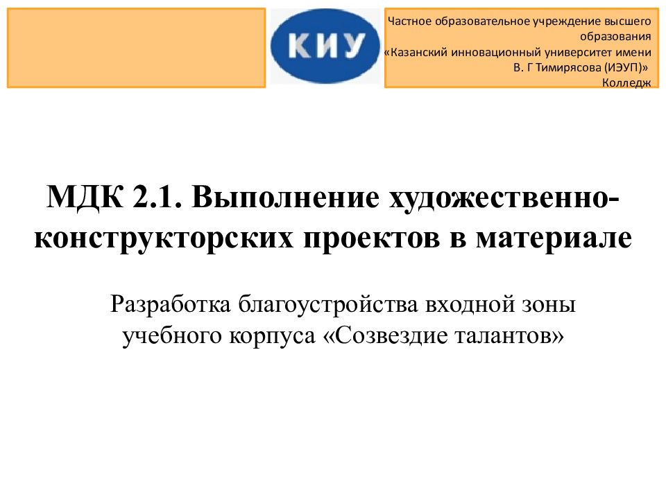 Разработка благоустройства входной зоны учебного корпуса «Созвездие талантов» Частное образовательное учреждение высшего образования «Казанский инновационный университет имени В. Г Тимирясова (ИЭУП)» Колледж