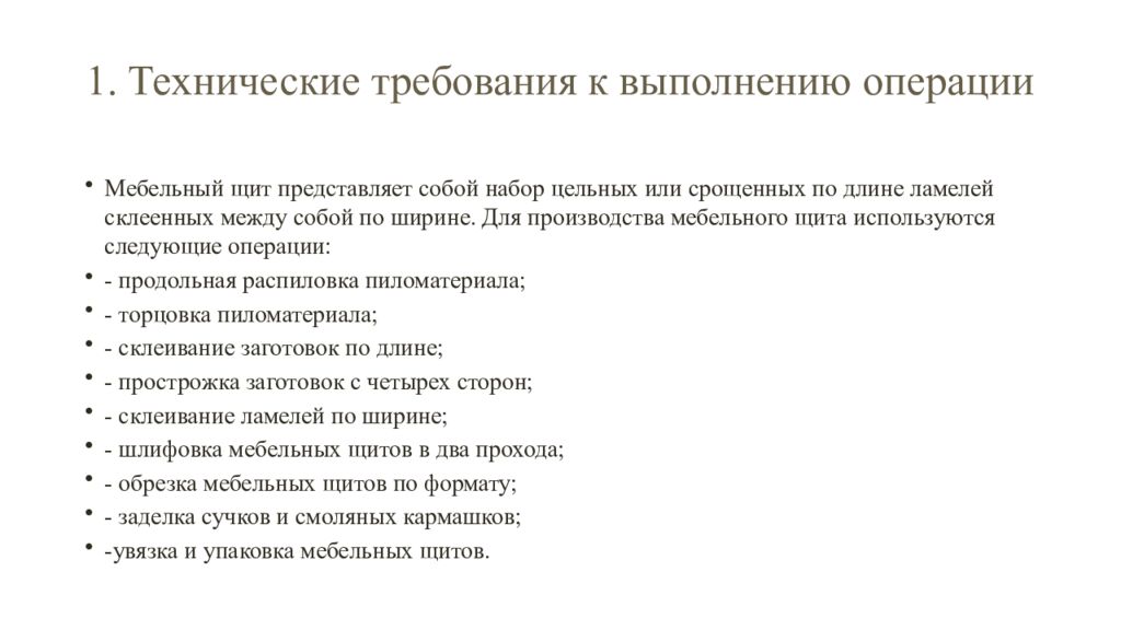 Мебельный щит представляет собой набор цельных или срощенных по длине ламелей склеенных между собой по ширине. Для производства мебельного щита используются следующие операции: - продольная распиловка пиломатериала; - торцовка пиломатериала; - склеивание заготовок по длине; - прострожка заготовок с четырех сторон; - склеивание ламелей по ширине; - шлифовка мебельных щитов в два прохода; - обрезка мебельных щитов по формату; - заделка сучков и смоляных кармашков; -увязка и упаковка мебельных щитов.