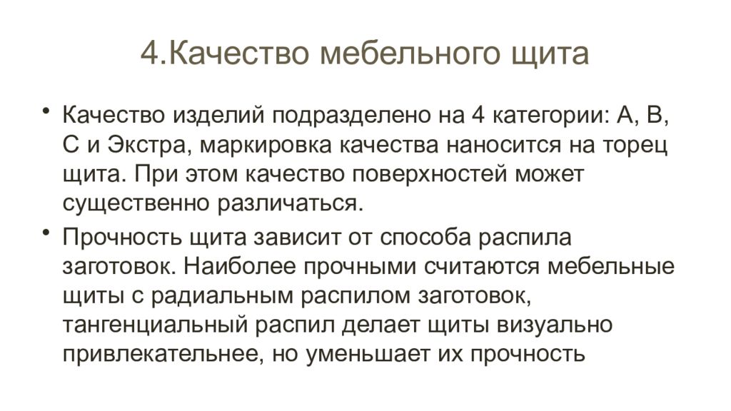 Качество изделий подразделено на 4 категории: А, B, C и Экстра, маркировка качества наносится на торец щита. При этом качество поверхностей может существенно различаться. Прочность щита зависит от способа распила заготовок. Наиболее прочными считаются мебельные щиты с радиальным распилом заготовок, тангенциальный распил делает щиты визуально привлекательнее, но уменьшает их прочность
