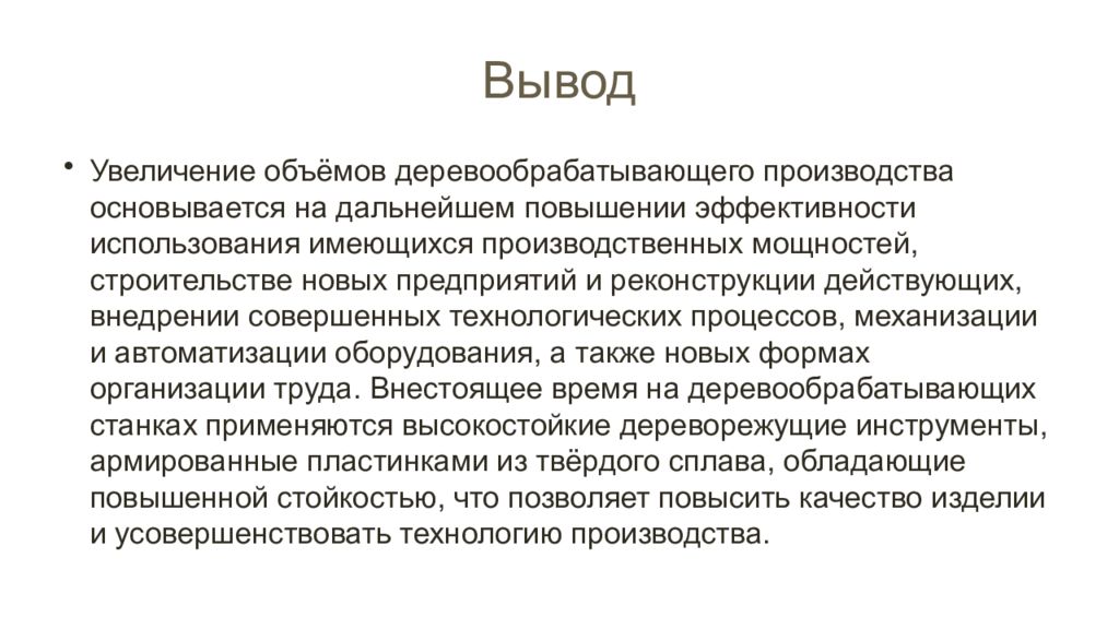 Увеличение объёмов деревообрабатывающего производства основывается на дальнейшем повышении эффективности использования имеющихся производственных мощностей, строительстве новых предприятий и реконструкции действующих, внедрении совершенных технологических процессов, механизации и автоматизации оборудования, а также новых формах организации труда. Внестоящее время на деревообрабатывающих станках применяются высокостойкие дереворежущие инструменты, армированные пластинками из твёрдого сплава, обладающие повышенной стойкостью, что позволяет повысить качество изделии и усовершенствовать технологию производства.