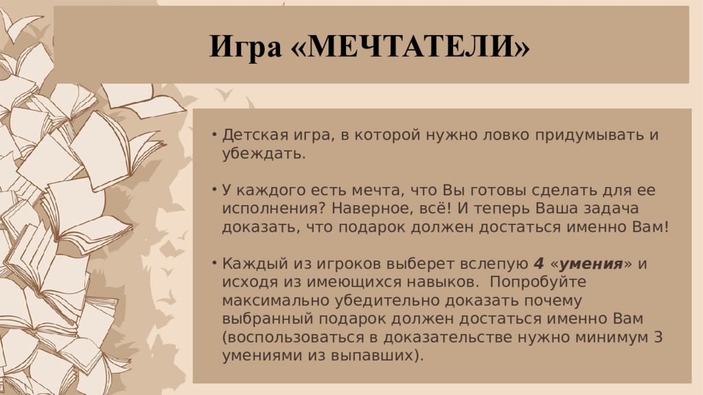 Детская игра, в которой нужно ловко придумывать и убеждать. У каждого есть мечта, что Вы готовы сделать для ее исполнения? Наверное, всё! И теперь Ваша задача доказать, что подарок должен достаться именно Вам ! Каждый из игроков выберет вслепую 4 « умения » и исходя из имеющихся навыков. Попробуйте максимально убедительно доказать почему выбранный подарок должен достаться именно Вам (воспользоваться в доказательстве нужно минимум 3 умениями из выпавших ).