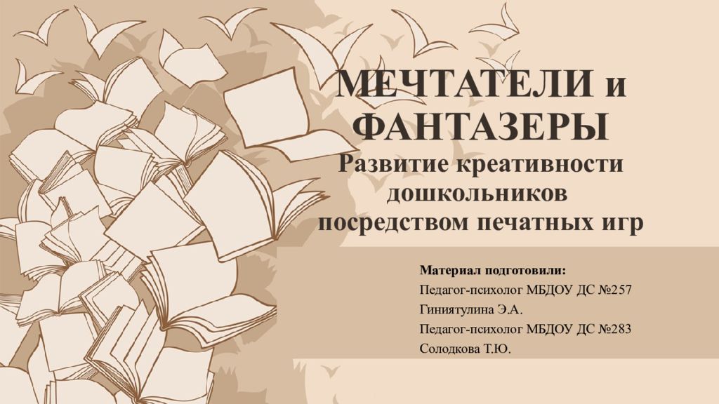 Первый слайд презентации: МЕЧТАТЕЛИ и ФАНТАЗЕРЫ Развитие креативности дошкольников посредством печатных игр
