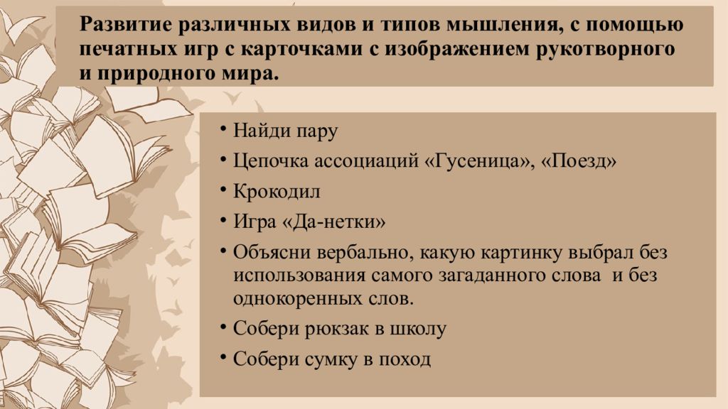 Слайд 7: Развитие различных видов и типов мышления, с помощью печатных игр с карточками с изображением рукотворного и природного мира