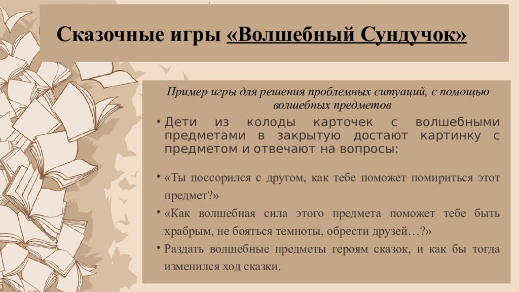 Пример игры для решения проблемных ситуаций, с помощью волшебных предметов Дети из колоды карточек с волшебными предметами в закрытую достают картинку с предметом и отвечают на вопросы : «Ты поссорился с другом, как тебе поможет помириться этот предмет?» «Как волшебная сила этого предмета поможет тебе быть храбрым, не бояться темноты, обрести друзей…?» Раздать волшебные предметы героям сказок, и как бы тогда изменился ход сказки.