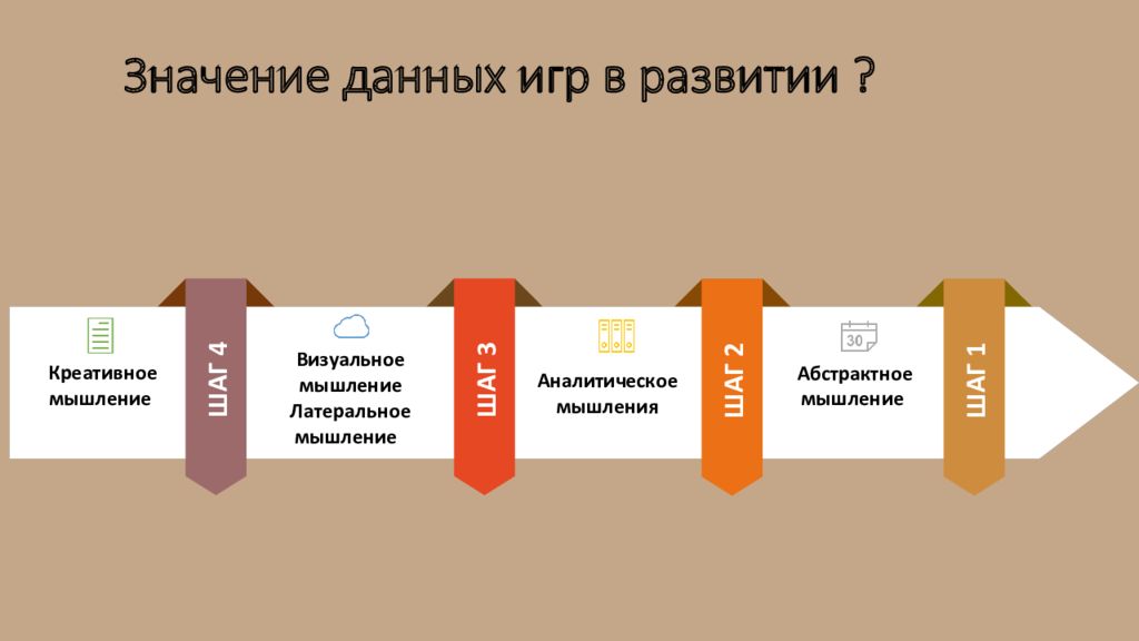 Абстрактное мышление ШАГ 1 Аналитическое мышления ШАГ 2 Визуальное мышление Латеральное мышление ШАГ 3 Креативное мышление ШАГ 4 Значение данных игр в развитии ?
