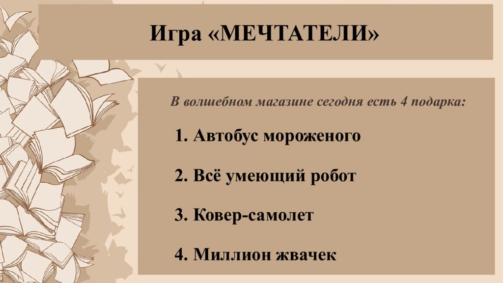 В волшебном магазине сегодня есть 4 подарка : 1. Автобус мороженого 2. Всё умеющий робот 3. Ковер-самолет 4. Миллион жвачек