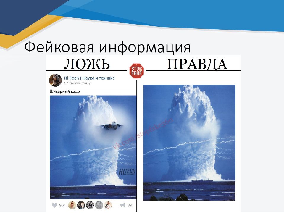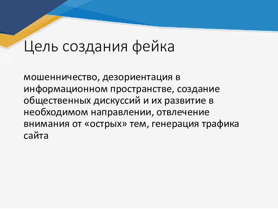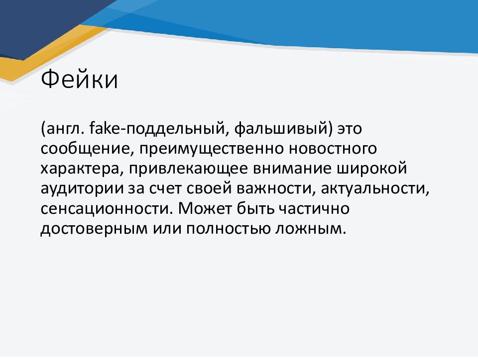 (англ. fake -поддельный, фальшивый) это сообщение, преимущественно новостного характера, привлекающее внимание широкой аудитории за счет своей важности, актуальности, сенсационности. Может быть частично достоверным или полностью ложным.