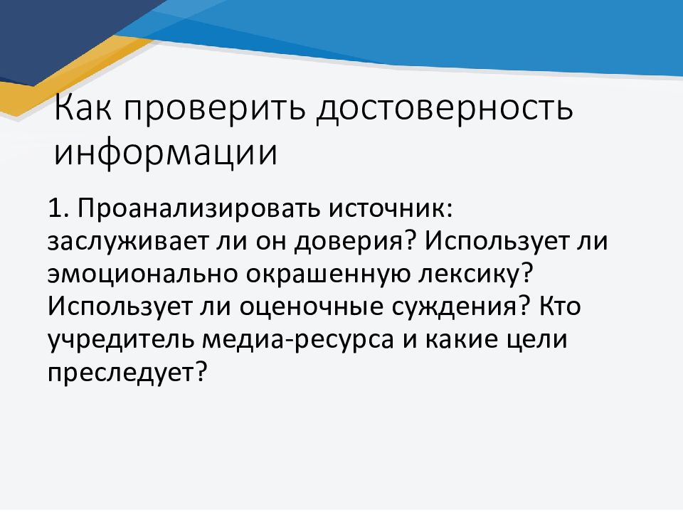 1. Проанализировать источник: заслуживает ли он доверия? Использует ли эмоционально окрашенную лексику? Использует ли оценочные суждения? Кто учредитель медиа-ресурса и какие цели преследует?