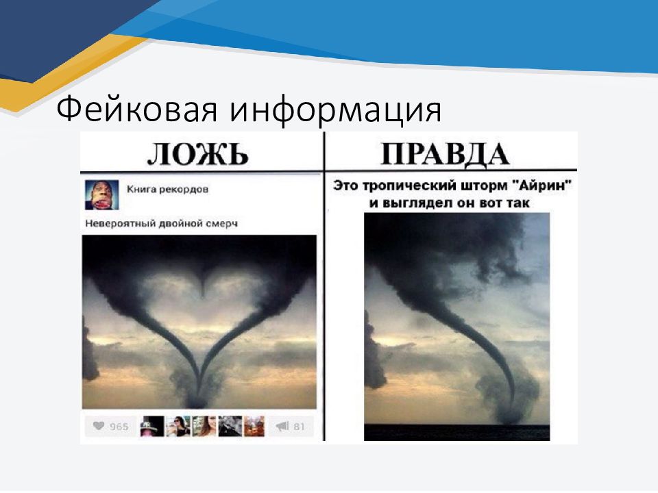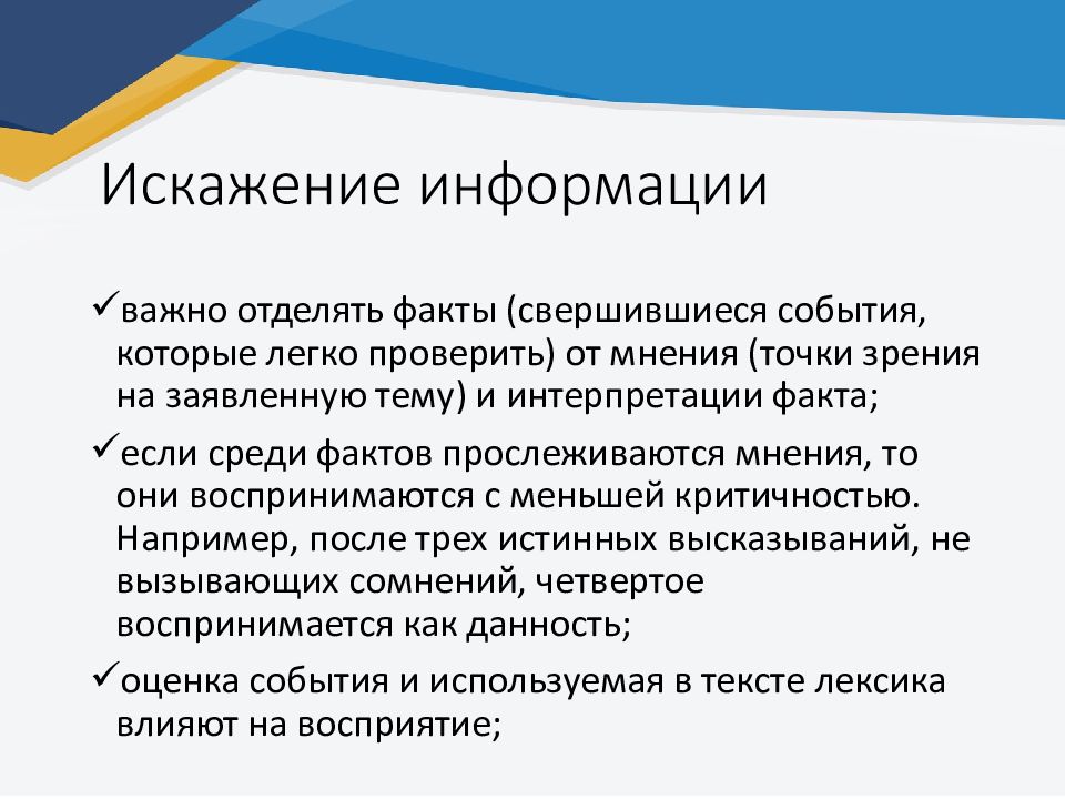 важно отделять факты (свершившиеся события, которые легко проверить) от мнения (точки зрения на заявленную тему) и интерпретации факта; если среди фактов прослеживаются мнения, то они воспринимаются с меньшей критичностью. Например, после трех истинных высказываний, не вызывающих сомнений, четвертое воспринимается как данность; о ценка события и используемая в тексте лексика влияют на восприятие;