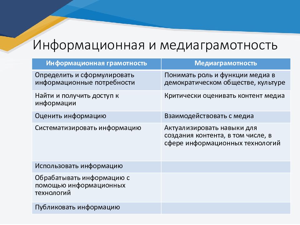 Информационная грамотность Медиаграмотность Определить и сформулировать информационные потребности Понимать роль и функции медиа в демократическом обществе, культуре Найти и получить доступ к информации Критически оценивать контент медиа Оценить информацию Взаимодействовать с медиа Систематизировать информацию Актуализировать навыки для создания контента, в том числе, в сфере информационных технологий Использовать информацию Обрабатывать информацию с помощью информационных технологий Публиковать информацию