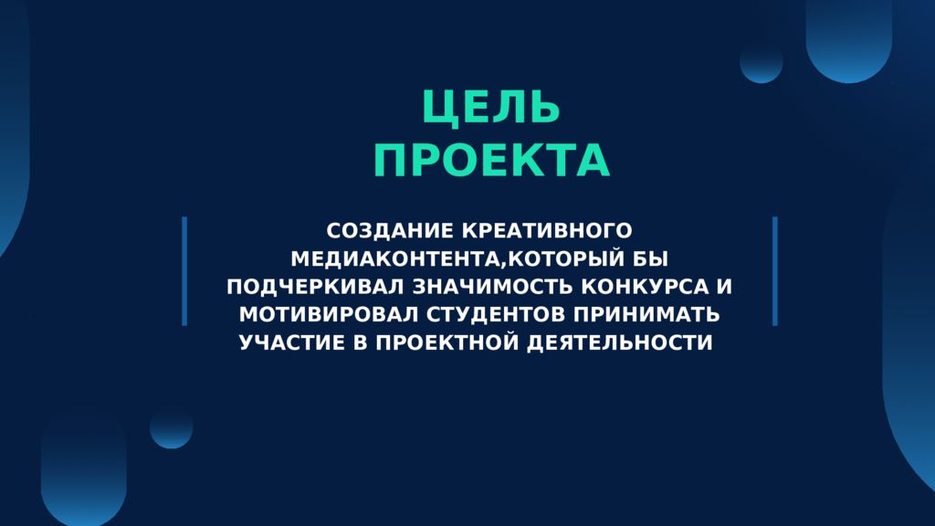 ЦЕЛЬ ПРОЕКТА СОЗДАНИЕ КРЕАТИВНОГО МЕДИАКОНТЕНТА,КОТОРЫЙ БЫ ПОДЧЕРКИВАЛ ЗНАЧИМОСТЬ КОНКУРСА И МОТИВИРОВАЛ СТУДЕНТОВ ПРИНИМАТЬ УЧАСТИЕ В ПРОЕКТНОЙ ДЕЯТЕЛЬНОСТИ