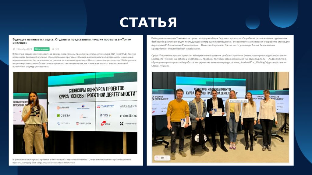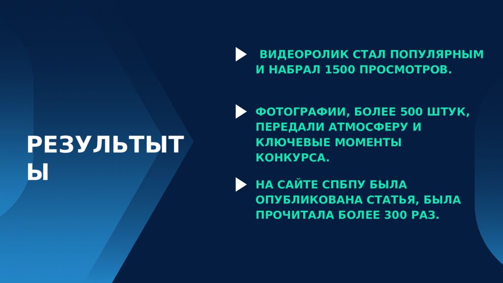 ФОТОГРАФИИ, БОЛЕЕ 500 ШТУК, ПЕРЕДАЛИ АТМОСФЕРУ И КЛЮЧЕВЫЕ МОМЕНТЫ КОНКУРСА. ВИДЕОРОЛИК СТАЛ ПОПУЛЯРНЫМ И НАБРАЛ 1500 ПРОСМОТРОВ. НА САЙТЕ СПБПУ БЫЛА ОПУБЛИКОВАНА СТАТЬЯ, БЫЛА ПРОЧИТАЛА БОЛЕЕ 300 РАЗ. РЕЗУЛЬТЫТЫ