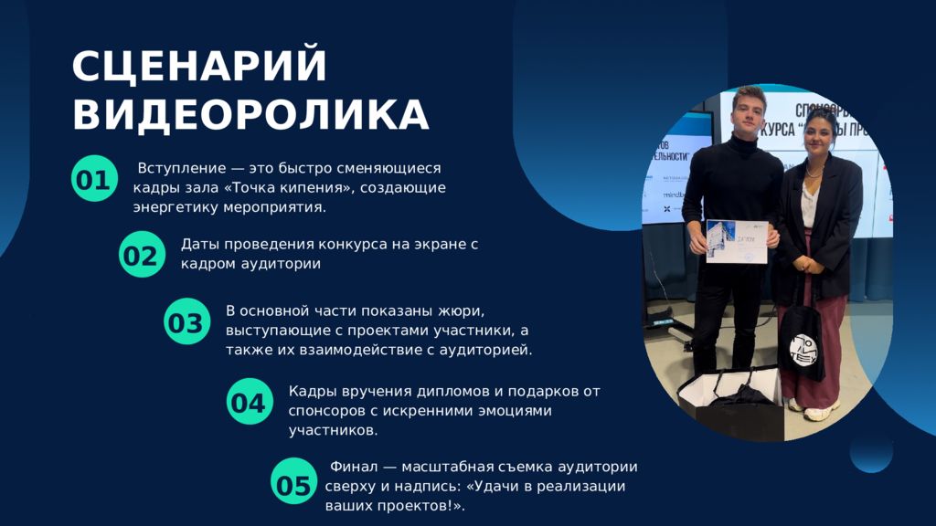 05 СЦЕНАРИЙ ВИДЕОРОЛИКА 01 02 03 04 Вступление — это быстро сменяющиеся кадры зала «Точка кипения», создающие энергетику мероприятия. Даты проведения конкурса на экране с кадром аудитории В основной части показаны жюри, выступающие с проектами участники, а также их взаимодействие с аудиторией. Кадры вручения дипломов и подарков от спонсоров с искренними эмоциями участников. Финал — масштабная съемка аудитории сверху и надпись: «Удачи в реализации ваших проектов!».