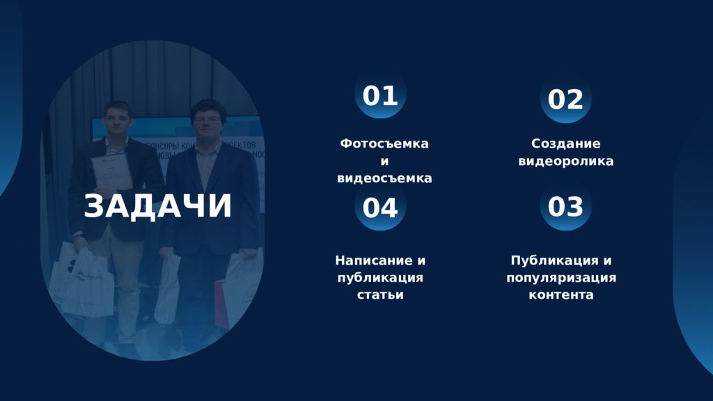 01 04 ЗАДАЧИ Фотосъемка и видеосъемка 02 Публикация и популяризация контента 03 Создание видеоролика Написание и публикация статьи