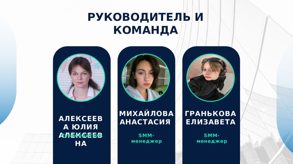 АЛЕКСЕЕВА ЮЛИЯ АЛЕКСЕЕВНА Руководитель МИХАЙЛОВА АНАСТАСИЯ SMM-менеджер ГРАНЬКОВА ЕЛИЗАВЕТА SMM- менеджер РУКОВОДИТЕЛЬ И КОМАНДА