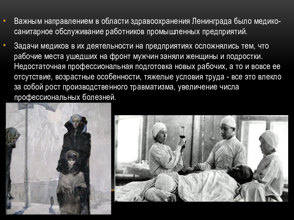 Важным направлением в области здравоохранения Ленинграда было медико-санитарное обслуживание работников промышленных предприятий. Задачи медиков в их деятельности на предприятиях осложнялись тем, что рабочие места ушедших на фронт мужчин заняли женщины и подростки. Недостаточная профессиональная подготовка новых рабочих, а то и вовсе ее отсутствие, возрастные особенности, тяжелые условия труда - все это влекло за собой рост производственного травматизма, увеличение числа профессиональных болезней.