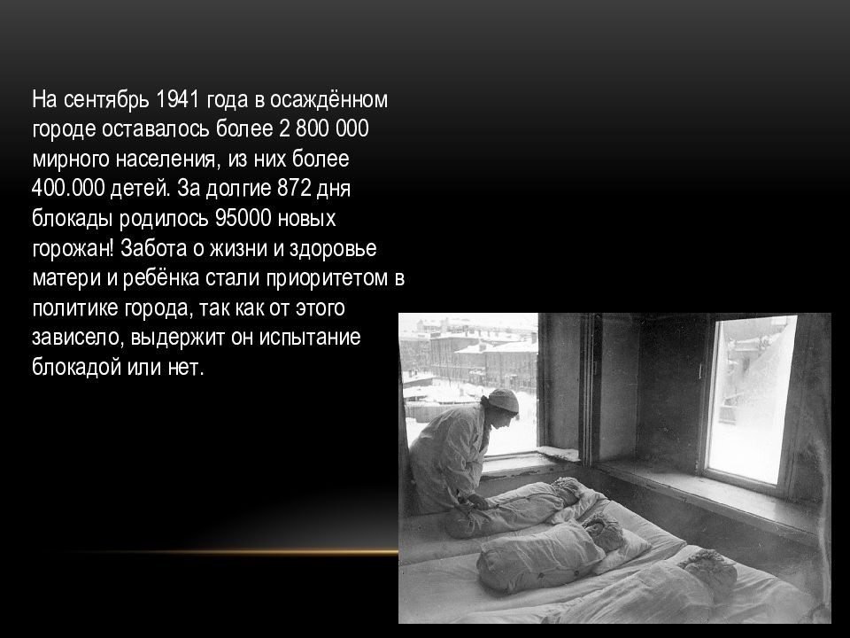 На сентябрь 1941 года в осаждённом городе оставалось более 2 800 000 мирного населения, из них более 400.000 детей. За долгие 872 дня блокады родилось 95000 новых горожан! Забота о жизни и здоровье матери и ребёнка стали приоритетом в политике города, так как от этого зависело, выдержит он испытание блокадой или нет.
