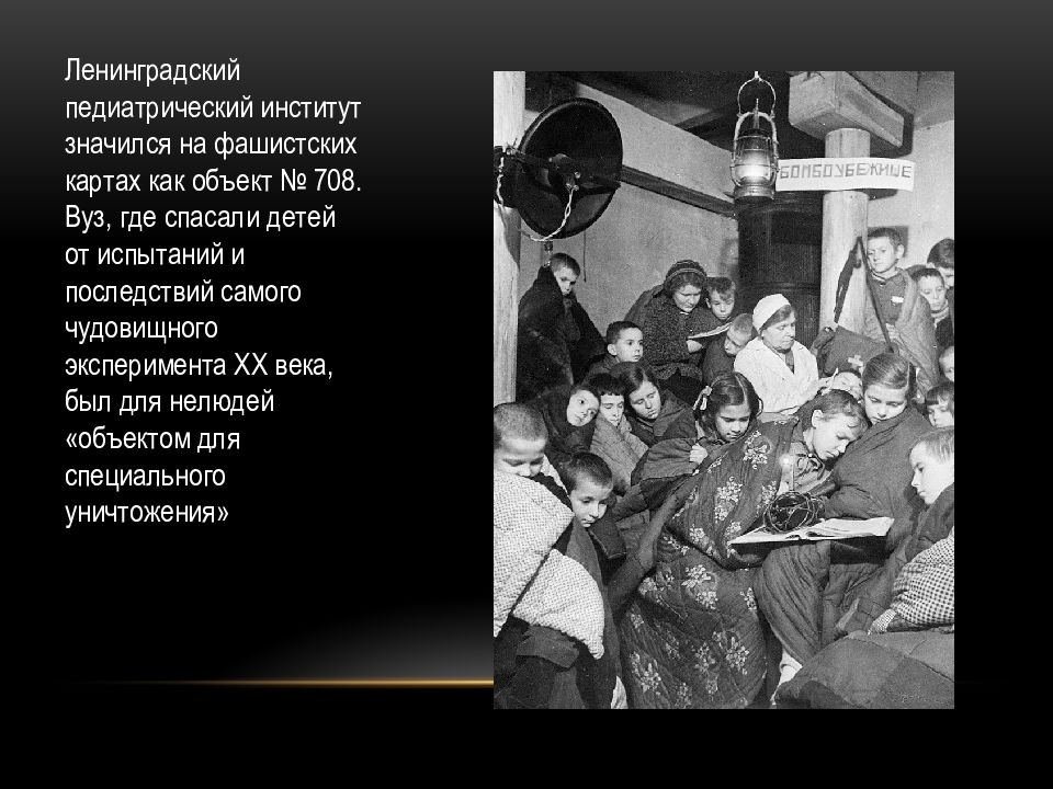 Ленинградский педиатрический институт значился на фашистских картах как объект № 708. Вуз, где спасали детей от испытаний и последствий самого чудовищного эксперимента ХХ века, был для нелюдей «объектом для специального уничтожения»