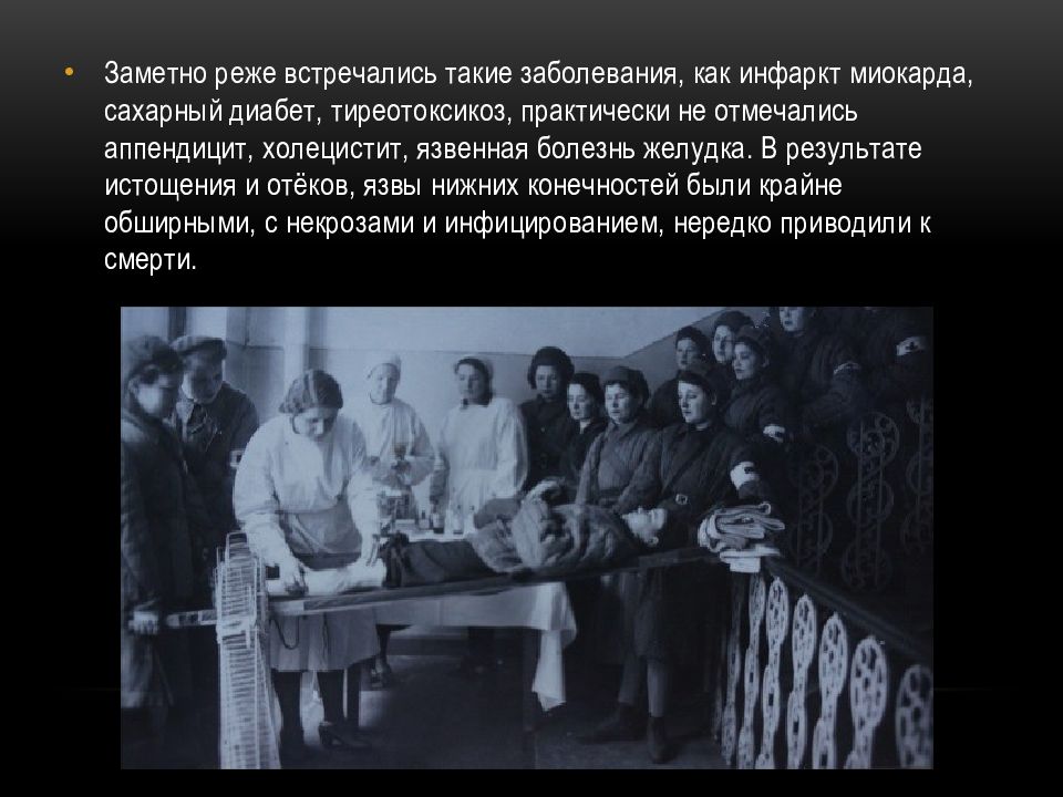 Заметно реже встречались такие заболевания, как инфаркт миокарда, сахарный диабет, тиреотоксикоз, практически не отмечались аппендицит, холецистит, язвенная болезнь желудка. В результате истощения и отёков, язвы нижних конечностей были крайне обширными, с некрозами и инфицированием, нередко приводили к смерти.