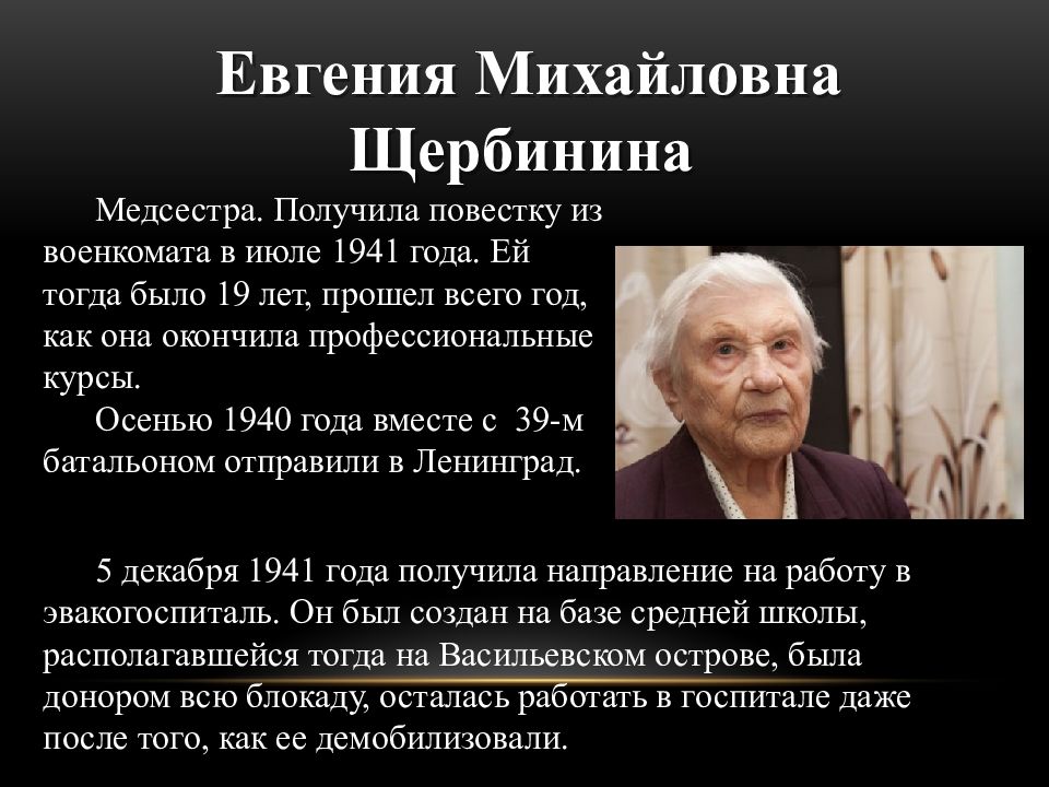 Медсестра. Получила повестку из военкомата в июле 1941 года. Ей тогда было 19 лет, прошел всего год, как она окончила профессиональные курсы. Осенью 1940 года вместе с 39-м батальоном отправили в Ленинград. Евгения Михайловна Щербинина 5 декабря 1941 года получила направление на работу в эвакогоспиталь. Он был создан на базе средней школы, располагавшейся тогда на Васильевском острове, была донором всю блокаду, осталась работать в госпитале даже после того, как ее демобилизовали.